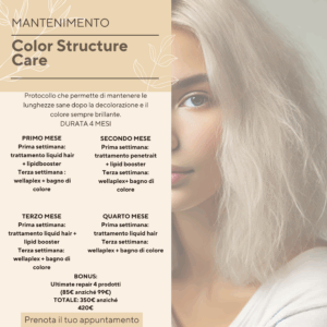 Il pacchetto Color Structure Care è un protocollo professionale studiato per mantenere la struttura dei capelli sana e il colore brillante dopo trattamenti intensivi come schiariture e colorazioni. Vediamo i benefici reali e concreti per la cliente che lo segue per 4 mesi: