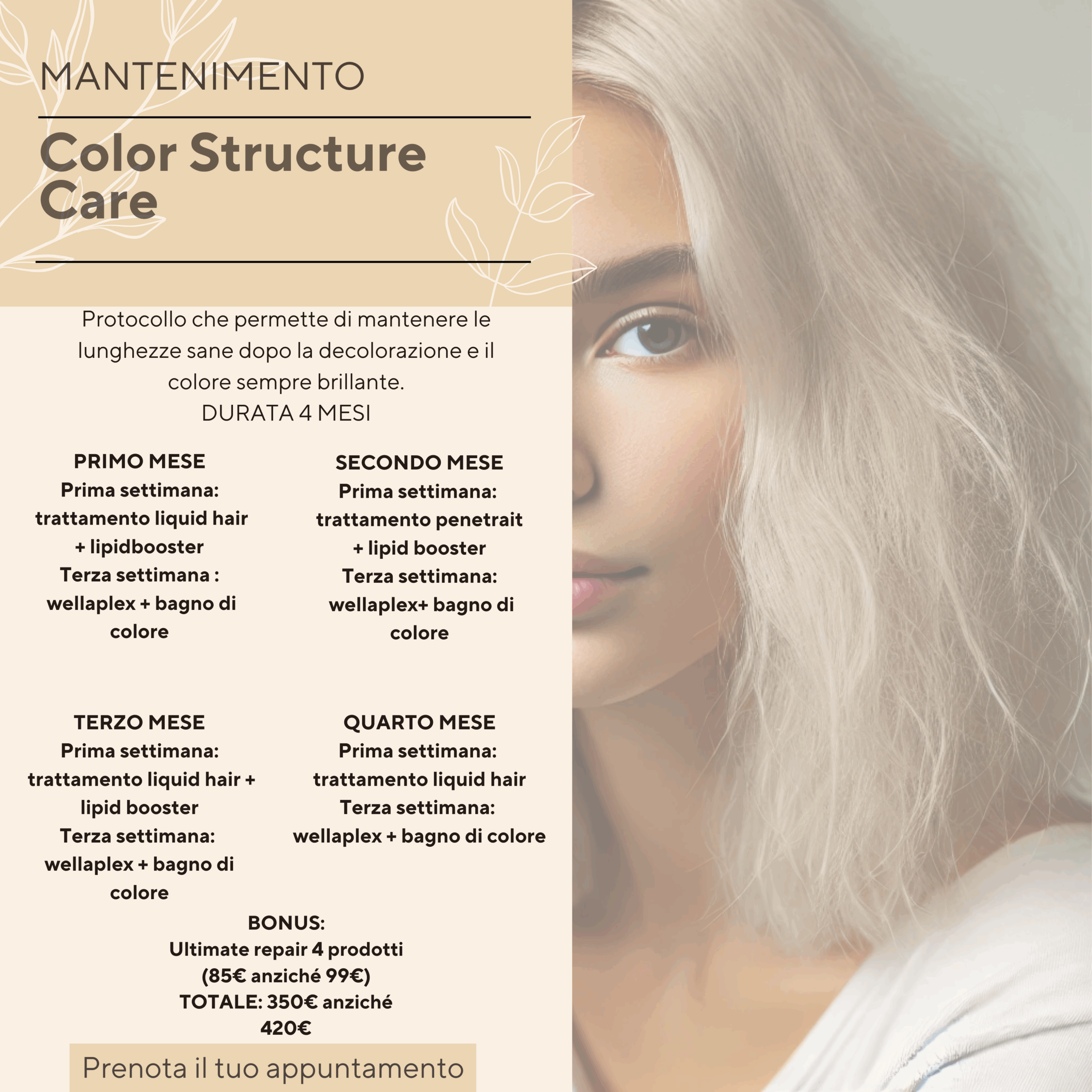 Il pacchetto Color Structure Care è un protocollo professionale studiato per mantenere la struttura dei capelli sana e il colore brillante dopo trattamenti intensivi come schiariture e colorazioni. Vediamo i benefici reali e concreti per la cliente che lo segue per 4 mesi:
