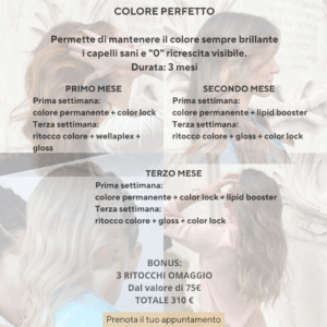 Il pacchetto Colore Perfetto è pensato per chi desidera avere sempre un colore impeccabile, brillante e uniforme, senza l’effetto antiestetico della ricrescita visibile. In quanto professionista del settore, posso assicurarti che questo tipo di programma è la chiave per capelli curati, luminosi e in salute per tutto l’anno, soprattutto per chi colora regolarmente la chioma.